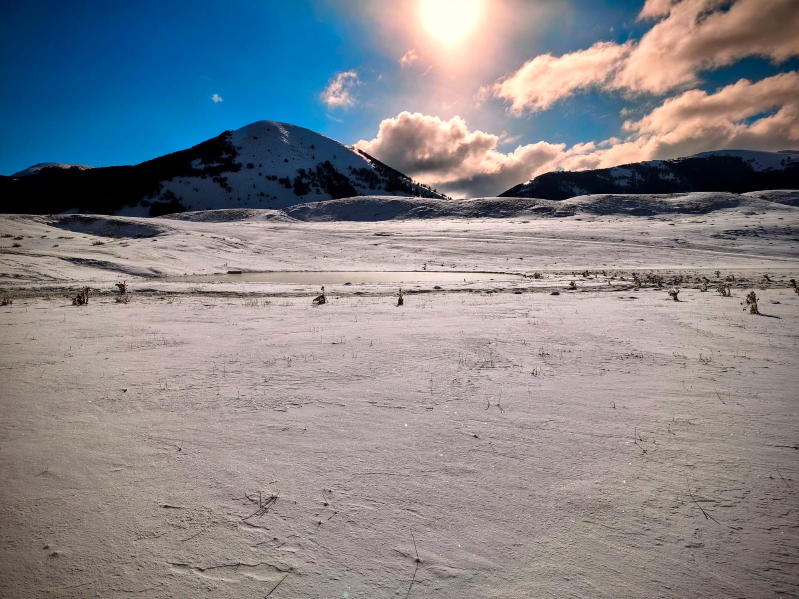 Un’escursione con le ciaspole ai piedi che si svolge nell’ambiente incontaminato dei Piani di Pezza incastonati dalle tante cime della catena montuosa del Velino Sirente che vi si affacciano come Punta Trento e Trieste, Costone della Cerasa, Cimata di Pezza e Cimata del Puzzillo.