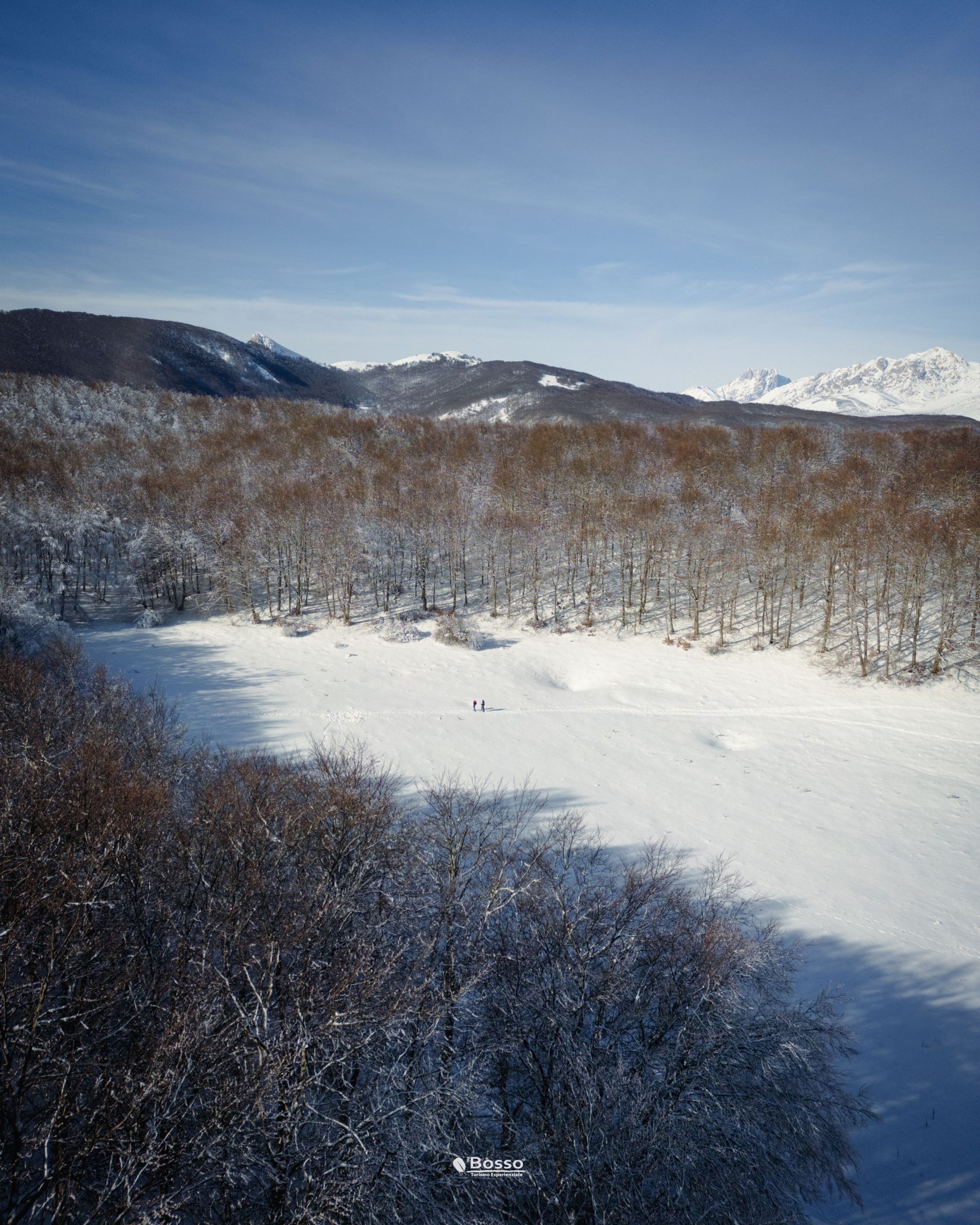 Attraversiamo la piana sulla quale sono evidenti le tracce di presenza degli animali che abitano questi luoghi come cervi, caprioli e lupi mentre gli scorci panoramici sulle montagne circostanti ci accolgono.