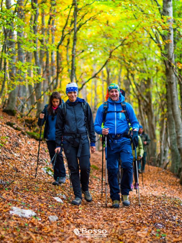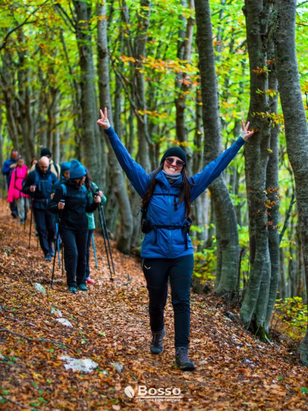 In questa stagione, quando i colori della montagna passano dal verde al giallo e poi le varie tonalità dell’arancio, attraversiamo maestose faggete calpestando letti di foglie rumorose e infine con un aereo sentiero di crinale raggiungiamo la cima del Monte Mileto sui pascoli di Mandra Castrata.